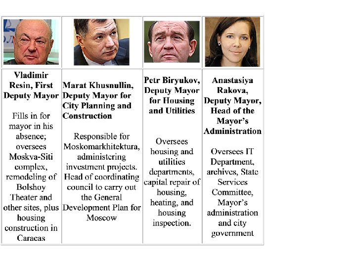 Luzhkov’s “Team” of closest advisors • • Yuriy Roslyak Valeriy Shantsev Vladimir Resin City Duma Speaker Vladimir Platonov