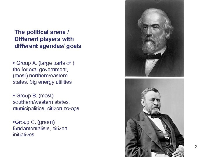 The political arena / Different players with different agendas/ goals • Group A. (large parts of ) the federal government, (most) northern/eastern states, big energy utilities • Group B. (most) southern/western states, municipalities, citizen co-ops • Group C. (green) fundamentalists, citizen initiatives 2