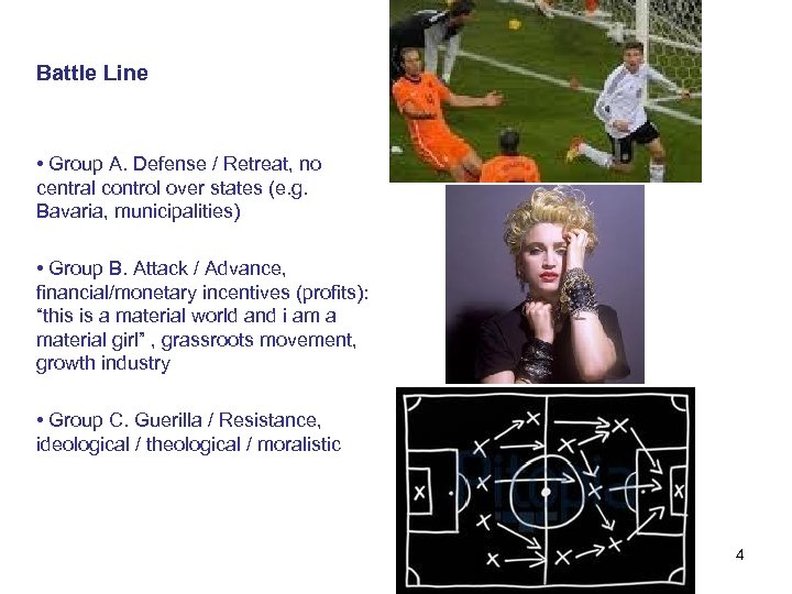 Battle Line • Group A. Defense / Retreat, no central control over states (e. g. Bavaria, municipalities) • Group B. Attack / Advance, financial/monetary incentives (profits): “this is a material world and i am a material girl” , grassroots movement, growth industry • Group C. Guerilla / Resistance, ideological / theological / moralistic 4
