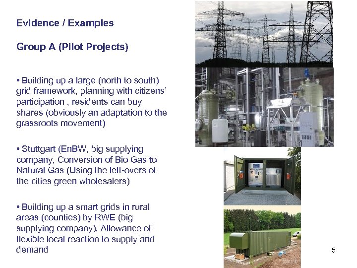 Evidence / Examples Group A (Pilot Projects) • Building up a large (north to south) grid framework, planning with citizens’ participation , residents can buy shares (obviously an adaptation to the grassroots movement) • Stuttgart (En. BW, big supplying company, Conversion of Bio Gas to Natural Gas (Using the left-overs of the cities green wholesalers) • Building up a smart grids in rural areas (counties) by RWE (big supplying company), Allowance of flexible local reaction to supply and demand 5