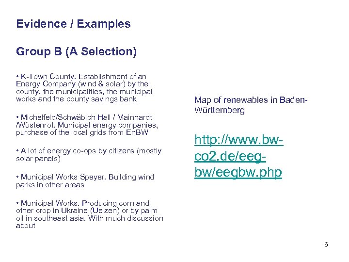 Evidence / Examples Group B (A Selection) • K-Town County. Establishment of an Energy Company (wind & solar) by the county, the municipalities, the municipal works and the county savings bank • Michelfeld/Schwäbich Hall / Mainhardt /Wüstenrot. Municipal energy companies, purchase of the local grids from En. BW • A lot of energy co-ops by citizens (mostly solar panels) • Municipal Works Speyer. Building wind parks in other areas Map of renewables in Baden. Württemberg http: //www. bwco 2. de/eegbw. php • Municipal Works. Producing corn and other crop in Ukraine (Uelzen) or by palm oil in southeast asia. With much discussion about 6