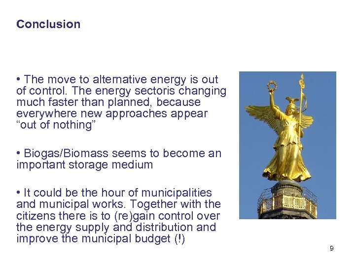 Conclusion • The move to alternative energy is out of control. The energy sectoris changing much faster than planned, because everywhere new approaches appear “out of nothing” • Biogas/Biomass seems to become an important storage medium • It could be the hour of municipalities and municipal works. Together with the citizens there is to (re)gain control over the energy supply and distribution and improve the municipal budget (!) 9