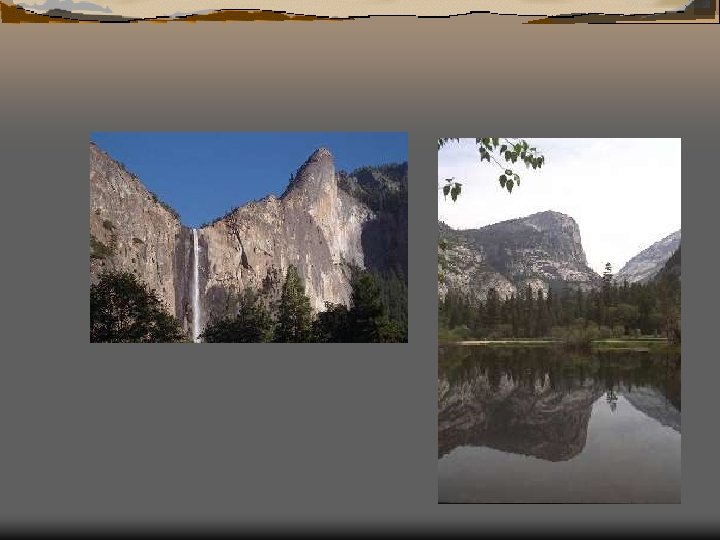 How the mountains and valleys were formed Ø At least four glaciers formed the walls of Yosemite Valley and helped to create the spectacular cliffs and waterfalls. Ø The snow from the Sierra Nevada mountain melted and followed the Merced River through Little Yosemite Valley.