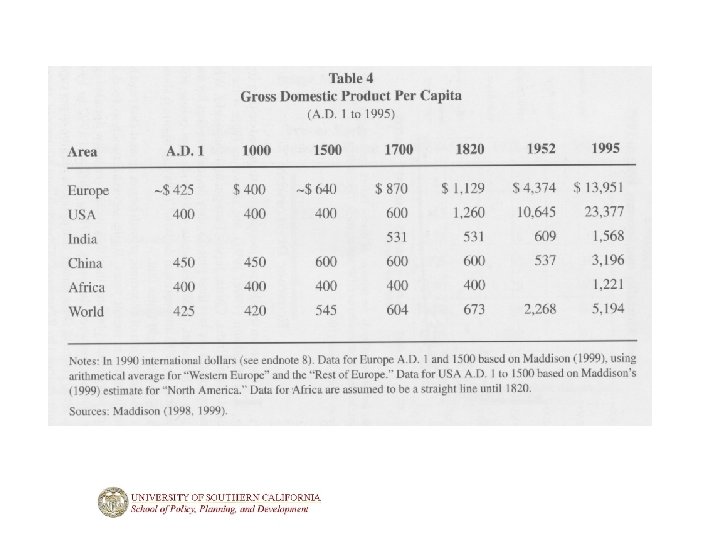 World History of GDP/Capita Trends Year Population in millions GDP person in year-2000 dollars 5000 BC 5 130 1000 BC 50 160 1 AD 170 135 1000 AD 265 1500 AD 425 175 1800 AD 900 250 1900 AD 1625 850 1950 AD 2515 2030 1975 AD 4080 4640 2000 AD 6120 8175 Source: Brad De. Long