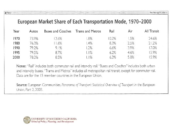 U. S. Public Transport Market Shares Year Public Transport Market Share 1950 18. 26% 1960 7. 11% 1970 3. 63% 1980 2. 82% 1990 2. 06% 1995 1. 79% 2000 1. 87% 2001 1. 84% 2002 1. 77% Without New York City 1. 16% Source: http: //www. publicpurpose. com/ut-usptshare 45. htm