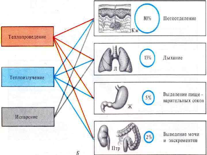 Skin (sweet glands) – 80%; respiratory system – 13%; gastrointestinal tract – 5%; excretion of urine and faeces – 2%.