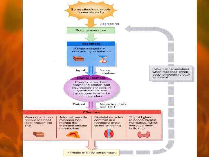 Mechanisms activated by cold ü Increased heat production ü Increased voluntary activity ü Increased secretion of Ad and NA ü Decreased heat loss ü Cutaneous vasoconstriction ü Pilomotoric reflex ü Curling up