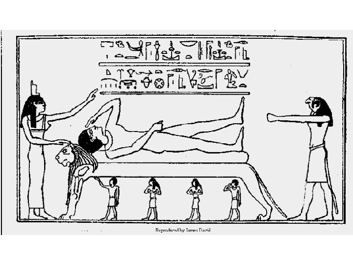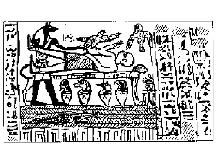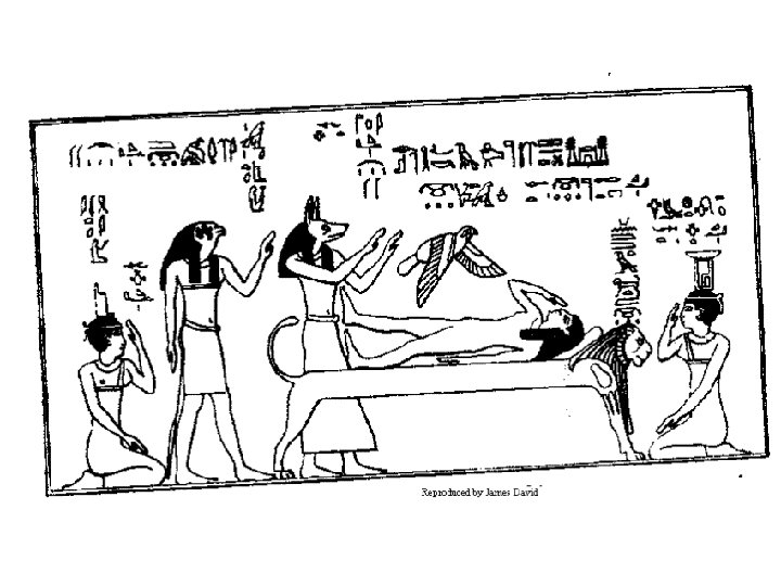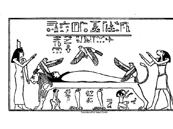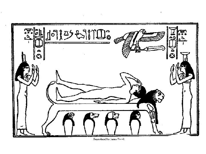 “This is a well-known scene from the Osiris mysteries, with Anubis, the jackal-headed god, on the left ministering to the dead Osiris on the bier. The pencilled(? ) restoration is incorrect. Anubis should be jackal-headed. The left arm of Osiris is in reality lying at his side under him. The apparent upper hand is part of the wing of a second bird which is hovering over the erect phallus of Osiris (now broken away). The second bird is Isis and she is magically impregnated by the dead Osiris and then later gives birth to Horus who avenges his father and takes over his inheritance. The complete bird represents Nephthys, sister to Osiris and Isis. Beneath the bier are the four canopic jars with heads representive of the four sons of Horus, human-headed Imseti, baboon-headed Hapy, jackal-headed Duamutef and falcon-headed Kebehsenuf. ” -- Richard A. Parker, Chairman of Department of Egyptology at Brown University, Dialogue: A Journal of Mormon Thought, vol. 3, no. 2, p. 86