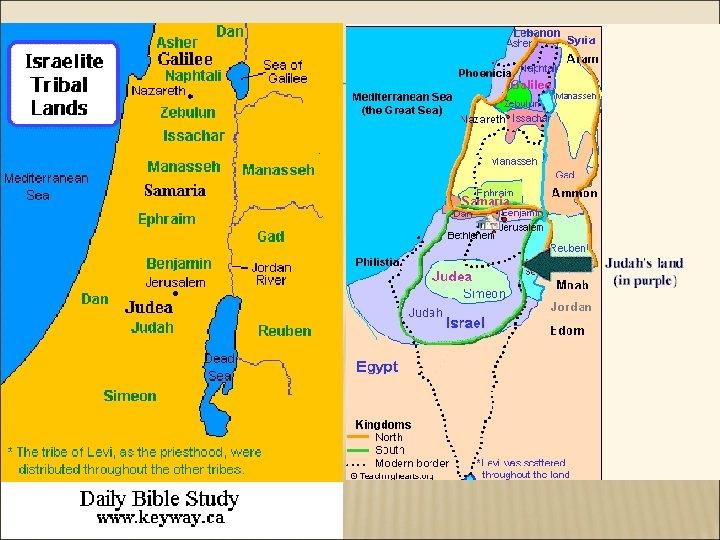 • • • The tribe of Judah received their allotment first (on the west side of the Jordan) The tribe of Judah probably received first consideration in the text because it was the tribe that had received Jacob's special patriarchal blessing. It was also the largest tribe. Judah was the southernmost tribe west of the Jordan. Caleb's family and the Simeonites lived within Judah's territory. Simeon was the smallest tribe except Levi and lost its territorial identity within Judah shortly after the conquest (cf. Gen. 49: 7). For this reason some maps of the tribal allotments do not include Simeon.