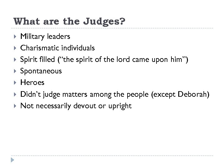 What are the Judges? Military leaders Charismatic individuals Spirit filled (“the spirit of the lord came upon him”) Spontaneous Heroes Didn’t judge matters among the people (except Deborah) Not necessarily devout or upright