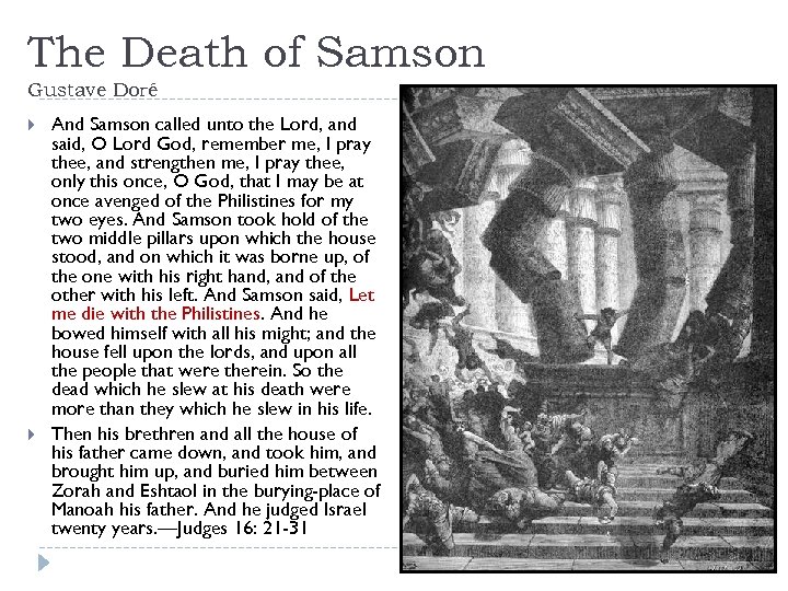 The Death of Samson Gustave Doré And Samson called unto the Lord, and said, O Lord God, remember me, I pray thee, and strengthen me, I pray thee, only this once, O God, that I may be at once avenged of the Philistines for my two eyes. And Samson took hold of the two middle pillars upon which the house stood, and on which it was borne up, of the one with his right hand, and of the other with his left. And Samson said, Let me die with the Philistines. And he bowed himself with all his might; and the house fell upon the lords, and upon all the people that were therein. So the dead which he slew at his death were more than they which he slew in his life. Then his brethren and all the house of his father came down, and took him, and brought him up, and buried him between Zorah and Eshtaol in the burying-place of Manoah his father. And he judged Israel twenty years. —Judges 16: 21 -31