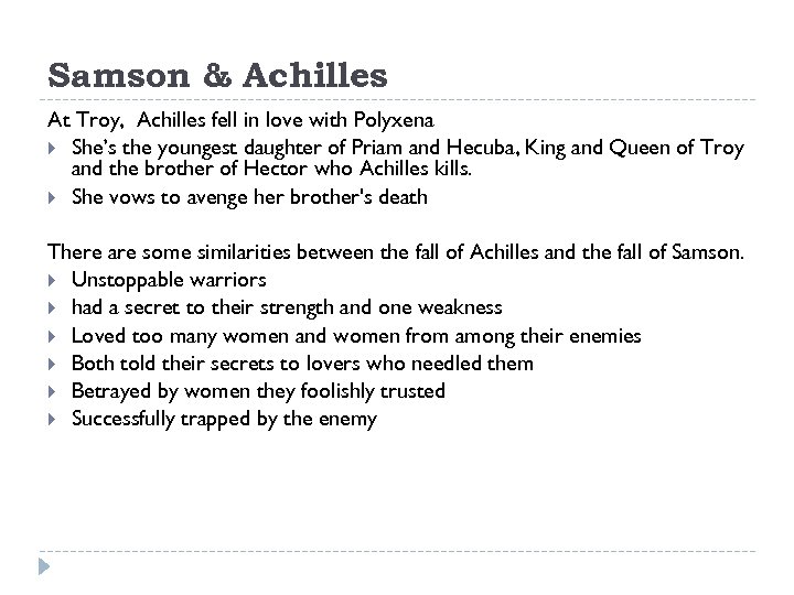 Samson & Achilles At Troy, Achilles fell in love with Polyxena She’s the youngest daughter of Priam and Hecuba, King and Queen of Troy and the brother of Hector who Achilles kills. She vows to avenge her brother's death There are some similarities between the fall of Achilles and the fall of Samson. Unstoppable warriors had a secret to their strength and one weakness Loved too many women and women from among their enemies Both told their secrets to lovers who needled them Betrayed by women they foolishly trusted Successfully trapped by the enemy