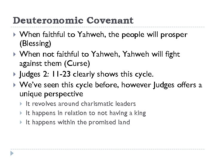 Deuteronomic Covenant When faithful to Yahweh, the people will prosper (Blessing) When not faithful to Yahweh, Yahweh will fight against them (Curse) Judges 2: 11 -23 clearly shows this cycle. We’ve seen this cycle before, however Judges offers a unique perspective It revolves around charismatic leaders It happens in relation to not having a king It happens within the promised land