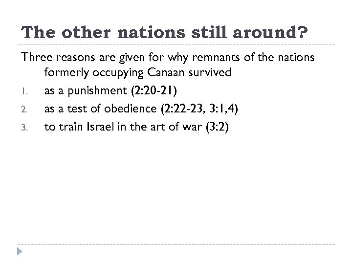 The other nations still around? Three reasons are given for why remnants of the nations formerly occupying Canaan survived 1. as a punishment (2: 20 -21) 2. as a test of obedience (2: 22 -23, 3: 1, 4) 3. to train Israel in the art of war (3: 2)