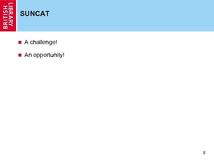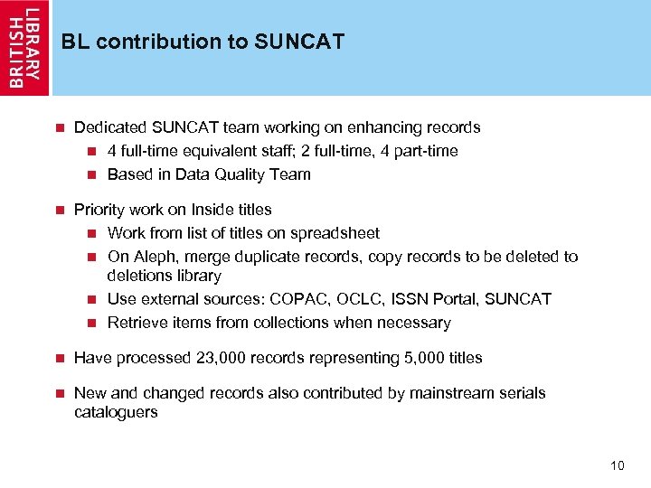 BL contribution to SUNCAT n Original dataset of 698, 137 records supplied n Supply monthly update files of records flagged as new, changed or deleted n Records are cleaned before submitting them i. e. all local and Aleph fields removed n Updates have now been loaded to SUNCAT 9