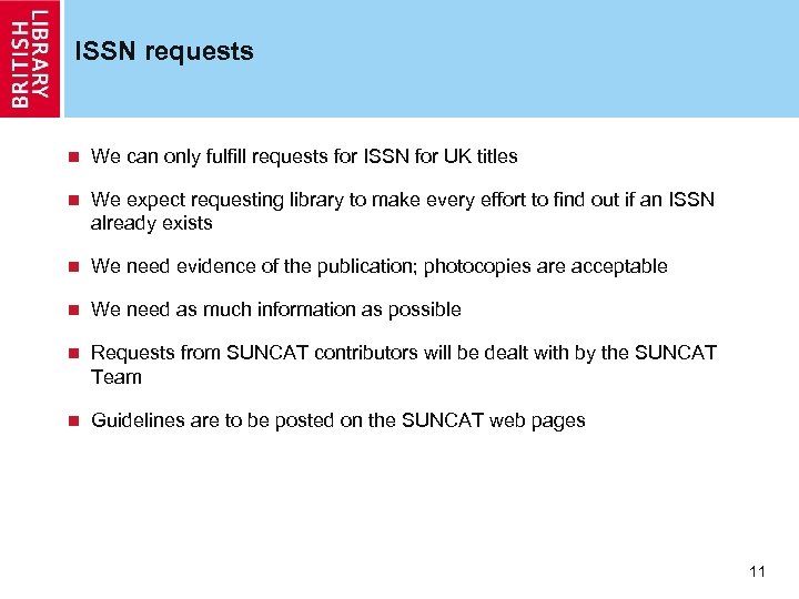 BL contribution to SUNCAT n Dedicated SUNCAT team working on enhancing records n 4 full-time equivalent staff; 2 full-time, 4 part-time n Based in Data Quality Team n Priority work on Inside titles n Work from list of titles on spreadsheet n On Aleph, merge duplicate records, copy records to be deleted to deletions library n Use external sources: COPAC, OCLC, ISSN Portal, SUNCAT n Retrieve items from collections when necessary n Have processed 23, 000 records representing 5, 000 titles n New and changed records also contributed by mainstream serials cataloguers 10
