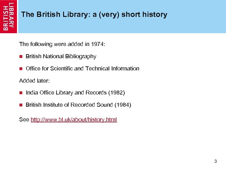 The British Library: a (very) short history n The British Library Act 1972 Combined: n British Museum library departments n National Central Library n National Lending Library for Science and Technology NCL & NLLST became the British Library Lending Division 2