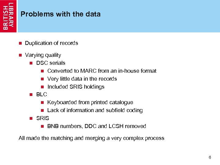 Integrated Library System Aleph implemented 2004 All the BL’s records in a single catalogue for the first time One bibliographic record per title Integration of non-bibliographic records also required Long period of preparation preceded implementation 5