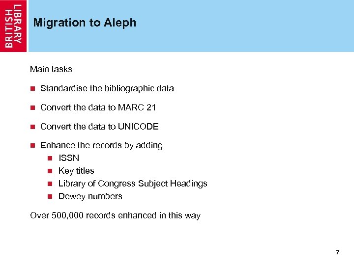 Problems with the data n Duplication of records n Varying quality n DSC serials n Converted to MARC from an in-house format n Very little data in the records n Included SRIS holdings n BLC n Keyboarded from printed catalogue n Lack of information and subfield coding n SRIS n BNB numbers, DDC and LCSH removed All made the matching and merging a very complex process 6