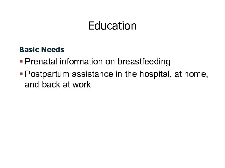 Education Basic Needs Prenatal information on breastfeeding Postpartum assistance in the hospital, at home, and back at work