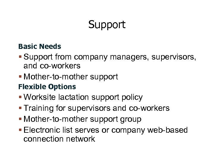 Support Basic Needs Support from company managers, supervisors, and co-workers Mother-to-mother support Flexible Options Worksite lactation support policy Training for supervisors and co-workers Mother-to-mother support group Electronic list serves or company web-based connection network