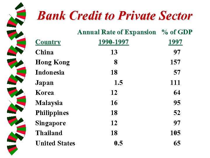 Bank Credit to Private Sector Annual Rate of Expansion % of GDP Country 1990 -1997 China 13 97 Hong Kong 8 157 Indonesia 18 57 Japan 1. 5 111 Korea 12 64 Malaysia 16 95 Philippines 18 52 Singapore 12 97 Thailand 18 105 United States 0. 5 65
