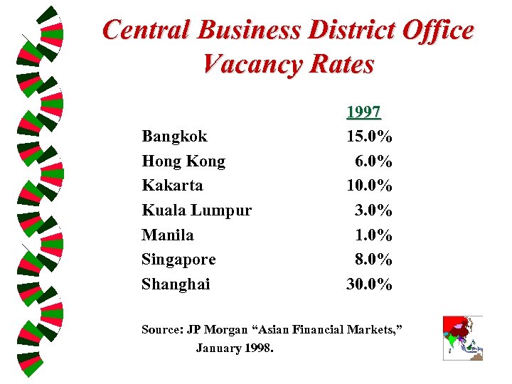 Central Business District Office Vacancy Rates Bangkok Hong Kakarta Kuala Lumpur Manila Singapore Shanghai 1997 15. 0% 6. 0% 10. 0% 3. 0% 1. 0% 8. 0% 30. 0% Source: JP Morgan “Asian Financial Markets, ” January 1998.