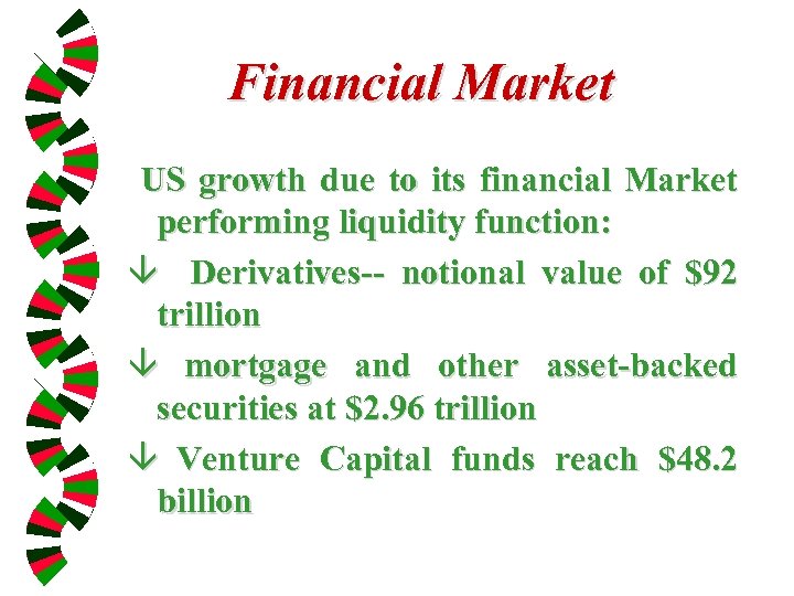 Financial Market US growth due to its financial Market performing liquidity function: â Derivatives-- notional value of $92 trillion â mortgage and other asset-backed securities at $2. 96 trillion â Venture Capital funds reach $48. 2 billion