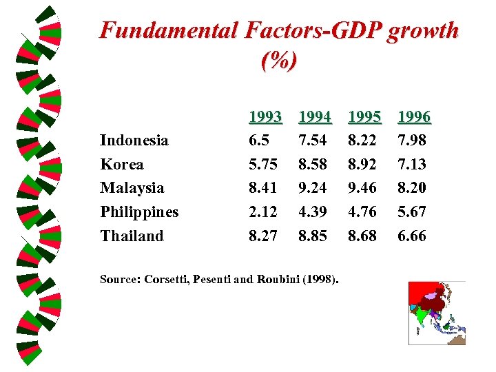 Fundamental Factors-GDP growth (%) Indonesia Korea Malaysia Philippines Thailand 1993 6. 5 5. 75 8. 41 2. 12 8. 27 1994 7. 54 8. 58 9. 24 4. 39 8. 85 Source: Corsetti, Pesenti and Roubini (1998). 1995 8. 22 8. 92 9. 46 4. 76 8. 68 1996 7. 98 7. 13 8. 20 5. 67 6. 66