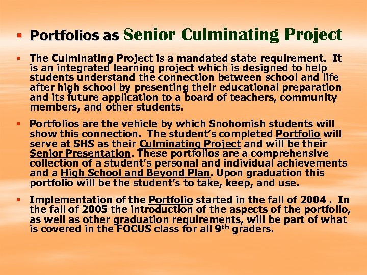 § Portfolios as Senior Culminating Project § The Culminating Project is a mandated state requirement. It is an integrated learning project which is designed to help students understand the connection between school and life after high school by presenting their educational preparation and its future application to a board of teachers, community members, and other students. § Portfolios are the vehicle by which Snohomish students will show this connection. The student’s completed Portfolio will serve at SHS as their Culminating Project and will be their Senior Presentation. These portfolios are a comprehensive collection of a student’s personal and individual achievements and a High School and Beyond Plan. Upon graduation this portfolio will be the student’s to take, keep, and use. § Implementation of the Portfolio started in the fall of 2004. In the fall of 2005 the introduction of the aspects of the portfolio, as well as other graduation requirements, will be part of what is covered in the FOCUS class for all 9 th graders.