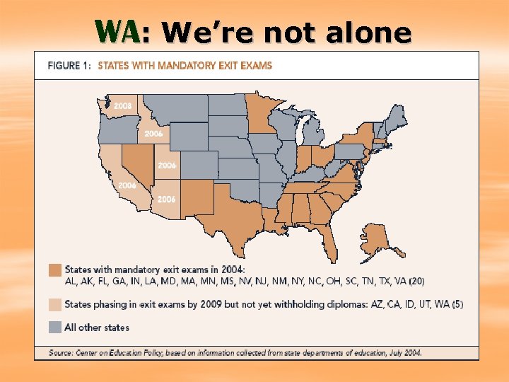 Alternatives to the WASL: § Students unable to demonstrate their skills on the WASL after two tries will have access to some kind of an alternative. This alternative could be in the form of an objective test, a portfolio, or an appeals process, but it must be ‘comparable in rigor’ to the WASL. What this looks like has not been determined to date. The state will make a decision regarding this at a later time.