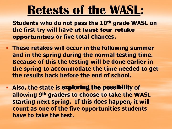 Retests of the WASL: Students who do not pass the 10 th grade WASL on the first try will have at least four retake opportunities or five total chances. § These retakes will occur in the following summer and in the spring during the normal testing time. Because of this the testing will be done earlier in the spring to accommodate the time needed to get the results back before the end of school. § Also, the state is exploring the possibility of allowing 9 th graders to choose to take the WASL starting next spring. If this does happen, it will count as one of the five opportunities students have to take the test.