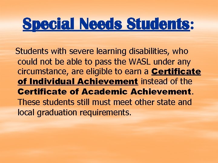Special Needs Students: Students with severe learning disabilities, who could not be able to pass the WASL under any circumstance, are eligible to earn a Certificate of Individual Achievement instead of the Certificate of Academic Achievement. These students still must meet other state and local graduation requirements.