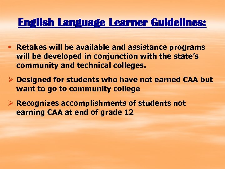 English Language Learner Guidelines: § Retakes will be available and assistance programs will be developed in conjunction with the state’s community and technical colleges. Ø Designed for students who have not earned CAA but want to go to community college Ø Recognizes accomplishments of students not earning CAA at end of grade 12