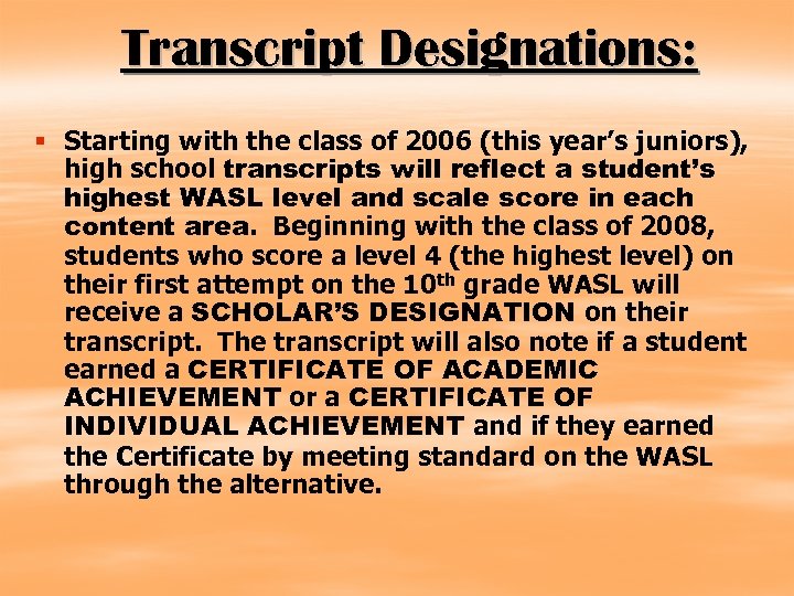 Transcript Designations: § Starting with the class of 2006 (this year’s juniors), high school transcripts will reflect a student’s highest WASL level and scale score in each content area. Beginning with the class of 2008, students who score a level 4 (the highest level) on their first attempt on the 10 th grade WASL will receive a SCHOLAR’S DESIGNATION on their transcript. The transcript will also note if a student earned a CERTIFICATE OF ACADEMIC ACHIEVEMENT or a CERTIFICATE OF INDIVIDUAL ACHIEVEMENT and if they earned the Certificate by meeting standard on the WASL through the alternative.