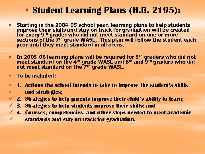 § Student Learning Plans (H. B. 2195): § Starting in the 2004 -05 school year, learning plans to help students improve their skills and stay on track for graduation will be created for every 9 th grader who did not meet standard on one or more sections of the 7 th grade WASL. This plan will follow the student each year until they meet standard in all areas. § In 2005 -06 learning plans will be required for 5 th graders who did not meet standard on the 4 th grade WASL and 8 th and 9 th graders who did not meet standard on the 7 th grade WASL. § To be included: ü ü ü 1. Actions the school intends to take to improve the student’s skills and strategies; 2. Strategies to help parents improve their child’s ability to learn; 3. Strategies to help students improve their skills; and 4. Courses, competencies, and other steps needed to meet academic standards and stay on track for graduation.