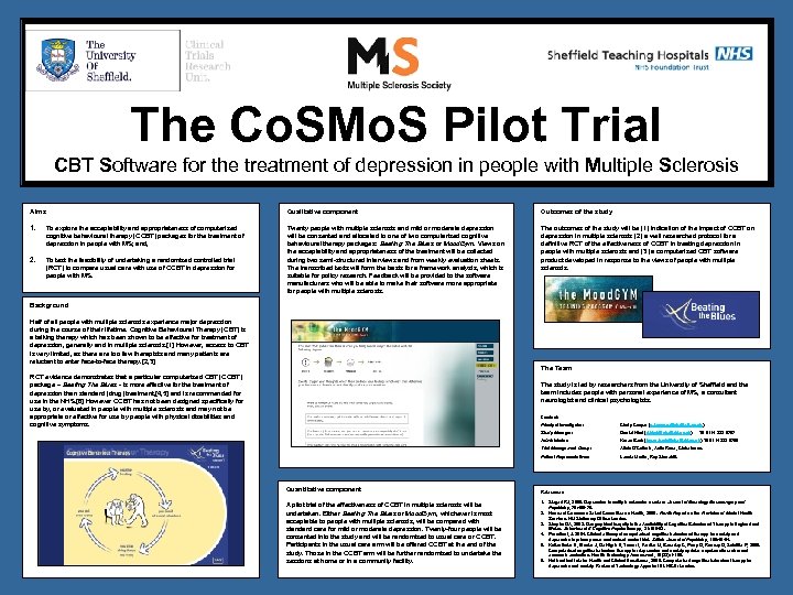 The Co. SMo. S Pilot Trial CBT Software for the treatment of depression in people with Multiple Sclerosis Aims Qualitative component Outcomes of the study 1. To explore the acceptability and appropriateness of computerised cognitive behavioural therapy (CCBT) packages for the treatment of depression in people with MS; and, 2. To test the feasibility of undertaking a randomised controlled trial (RCT) to compare usual care with use of CCBT in depression for people with MS. Twenty people with multiple sclerosis and mild or moderate depression will be consented and allocated to one of two computerised cognitive behavioural therapy packages: Beating The Blues or Mood. Gym. Views on the acceptability and appropriateness of the treatment will be collected during two semi-structured interviews and from weekly evaluation sheets. The transcribed texts will form the basis for a framework analysis, which is suitable for policy research. Feedback will be provided to the software manufacturers who will be able to make their software more appropriate for people with multiple sclerosis. The outcomes of the study will be (1) indication of the impact of CCBT on depression in multiple sclerosis (2) a well researched protocol for a definitive RCT of the effectiveness of CCBT in treating depression in people with multiple sclerosis and (3) a computerised CBT software product developed in response to the views of people with multiple sclerosis. Background Half of all people with multiple sclerosis experience major depression during the course of their lifetime. Cognitive Behavioural Therapy (CBT) is a talking therapy which has been shown to be effective for treatment of depression, generally and in multiple sclerosis. [1] However, access to CBT is very limited, as there are too few therapists and many patients are reluctant to enter face-to-face therapy. [2, 3] The Team RCT evidence demonstrates that a particular computerised CBT (CCBT) package – Beating The Blues - is more effective for the treatment of depression than standard (drug) treatment, [4, 5] and is recommended for use in the NHS. [6] However CCBT has not been designed specifically for use by, or evaluated in people with multiple sclerosis and may not be appropriate or effective for use by people with physical disabilities and cognitive symptoms. The study is led by researchers from the University of Sheffield and the team includes people with personal experience of MS, a consultant neurologist and clinical psychologists. Contact: Principal Investigator: Karen Beck (karen. beck@sheffield. ac. uk) 0114 222 0795 Trial Management Group : Alicia O’Cathain, Anita Rose, Claire Isaac. Patient Representatives: A pilot trial of the effectiveness of CCBT in multiple sclerosis will be undertaken. Either Beating The Blues or Mood. Gym, whichever is most acceptable to people with multiple sclerosis, will be compared with standard care for mild or moderate depression. Twenty-four people will be consented into the study and will be randomised to usual care or CCBT. Participants in the usual care arm will be offered CCBT at the end of the study. Those in the CCBT arm will be further randomised to undertake the sessions at home or in a community facility. Daniel Hind (d. hind@sheffield. ac. uk) Administrator: Quantitative component Cindy Cooper (c. l. cooper@sheffield. ac. uk) Study Manager: Leonie Martin, Ray Stonehill. 0114 222 0707 References 1. Siegert RJ, 2005. Depression in multiple sclerosis: a review. Journal of Neurology Neurosurgery and Psychiatry, 76: 469 -79. 2. House of Commons Select Committee on Health, 2000. Fourth Report on the Provision of Mental Health Services. HM Stationary Office: London. 3. Shapiro DA, 2003. Geographical Inequity in the Availability of Cognitive Behavioural Therapy in England Wales. Behavioural & Cognitive Psychotherapy , 31: 185 -92. 4. Proudfoot, J. 2004. Clinical efficacy of computerised cognitive behavioural therapy for anxiety and depression in primary care: randomised control trial. British Journal of Psychiatry, 185: 46 -54. 5. Kaltenthaler E, Brazier J, De Nigris E, Tumur I, Ferriter M, Beverley C, Parry G, Rooney G, Sutcliffe P, 2006. Computerised cognitive behaviour therapy for depression and anxiety update: a systematic review and economic evaluation. Health Technology Assessment , 10(33): 1 -168. 6. National Institute for Health and Clinical Excellence, 2006. Computerised cognitive behaviour therapy for depression and anxiety Review of Technology Appraisal 51. NICE: London.