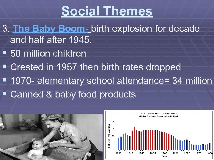 Social Themes 3. The Baby Boom- birth explosion for decade and half after 1945. § 50 million children § Crested in 1957 then birth rates dropped § 1970 - elementary school attendance= 34 million § Canned & baby food products