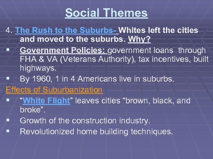 Social Themes 4. The Rush to the Suburbs- Whites left the cities and moved to the suburbs. Why? § Government Policies: government loans through FHA & VA (Veterans Authority), tax incentives, built highways. § By 1960, 1 in 4 Americans live in suburbs. Effects of Suburbanization § “White Flight” leaves cities “brown, black, and broke”. § Growth of the construction industry. § Revolutionized home building techniques.