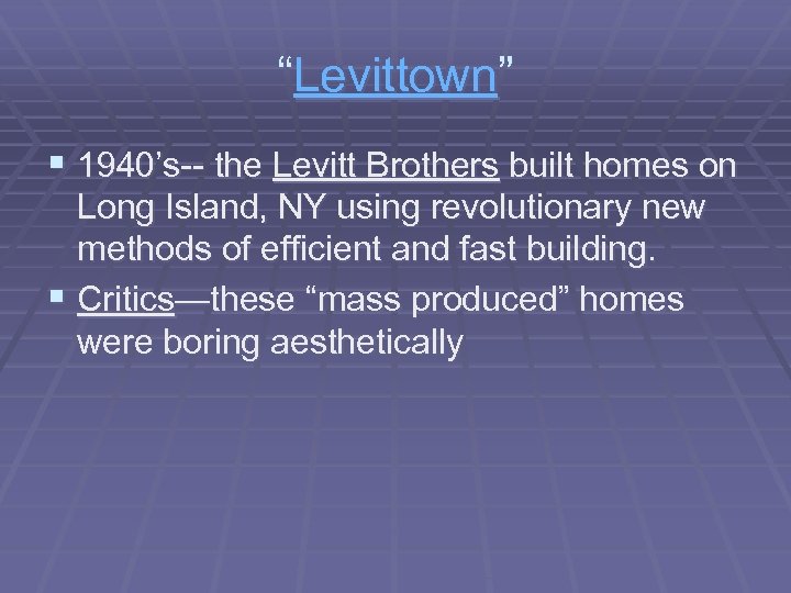 “Levittown” § 1940’s-- the Levitt Brothers built homes on Long Island, NY using revolutionary new methods of efficient and fast building. § Critics—these “mass produced” homes were boring aesthetically