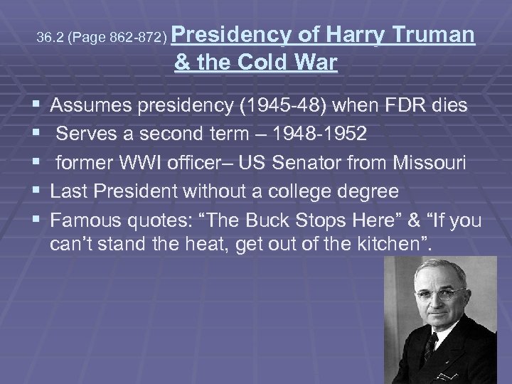 36. 2 (Page 862 -872) § § § Presidency of Harry Truman & the Cold War Assumes presidency (1945 -48) when FDR dies Serves a second term – 1948 -1952 former WWI officer– US Senator from Missouri Last President without a college degree Famous quotes: “The Buck Stops Here” & “If you can’t stand the heat, get out of the kitchen”.