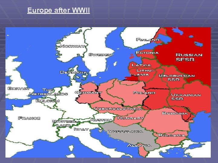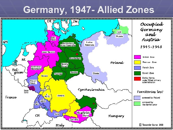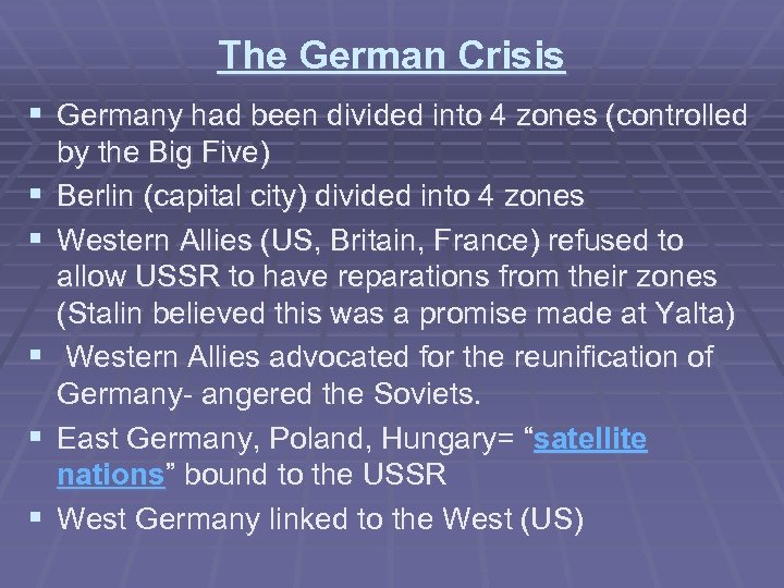 The German Crisis § Germany had been divided into 4 zones (controlled § § § by the Big Five) Berlin (capital city) divided into 4 zones Western Allies (US, Britain, France) refused to allow USSR to have reparations from their zones (Stalin believed this was a promise made at Yalta) Western Allies advocated for the reunification of Germany- angered the Soviets. East Germany, Poland, Hungary= “satellite nations” bound to the USSR West Germany linked to the West (US)