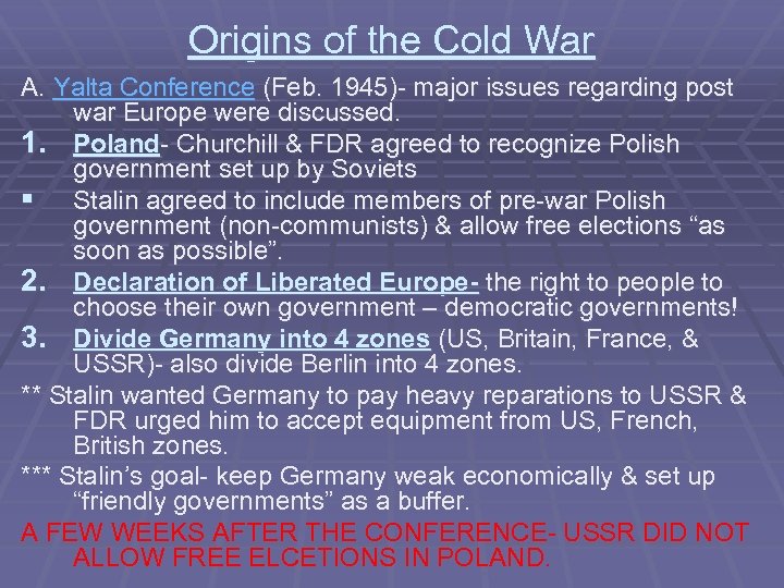 Origins of the Cold War A. Yalta Conference (Feb. 1945)- major issues regarding post war Europe were discussed. 1. Poland- Churchill & FDR agreed to recognize Polish government set up by Soviets § Stalin agreed to include members of pre-war Polish government (non-communists) & allow free elections “as soon as possible”. 2. Declaration of Liberated Europe- the right to people to choose their own government – democratic governments! 3. Divide Germany into 4 zones (US, Britain, France, & USSR)- also divide Berlin into 4 zones. ** Stalin wanted Germany to pay heavy reparations to USSR & FDR urged him to accept equipment from US, French, British zones. *** Stalin’s goal- keep Germany weak economically & set up “friendly governments” as a buffer. A FEW WEEKS AFTER THE CONFERENCE- USSR DID NOT ALLOW FREE ELCETIONS IN POLAND.