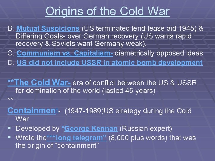 Origins of the Cold War B. Mutual Suspicions (US terminated lend-lease aid 1945) & Differing Goals- over German recovery (US wants rapid recovery & Soviets want Germany weak). C. Communism vs. Capitalism- diametrically opposed ideas D. US did not include USSR in atomic bomb development **The Cold War- era of conflict between the US & USSR for domination of the world (lasted 45 years) ** Containment- (1947 -1989)US strategy during the Cold War. § Developed by *George Kennan (Russian expert) § Wrote the**“long telegram” (8, 000 plus words) that was the origin of “containment”