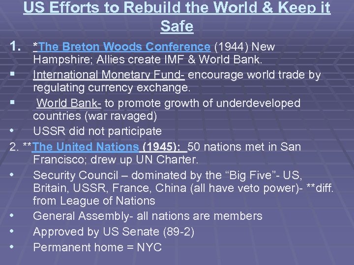 US Efforts to Rebuild the World & Keep it Safe 1. *The Breton Woods Conference (1944) New Hampshire; Allies create IMF & World Bank. § International Monetary Fund- encourage world trade by regulating currency exchange. § World Bank- to promote growth of underdeveloped countries (war ravaged) • USSR did not participate 2. **The United Nations (1945): 50 nations met in San Francisco; drew up UN Charter. • Security Council – dominated by the “Big Five”- US, Britain, USSR, France, China (all have veto power)- **diff. from League of Nations • General Assembly- all nations are members • Approved by US Senate (89 -2) • Permanent home = NYC