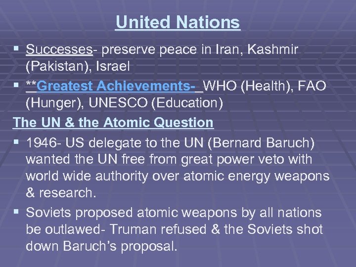 United Nations § Successes- preserve peace in Iran, Kashmir (Pakistan), Israel § **Greatest Achievements- WHO (Health), FAO (Hunger), UNESCO (Education) The UN & the Atomic Question § 1946 - US delegate to the UN (Bernard Baruch) wanted the UN free from great power veto with world wide authority over atomic energy weapons & research. § Soviets proposed atomic weapons by all nations be outlawed- Truman refused & the Soviets shot down Baruch’s proposal.