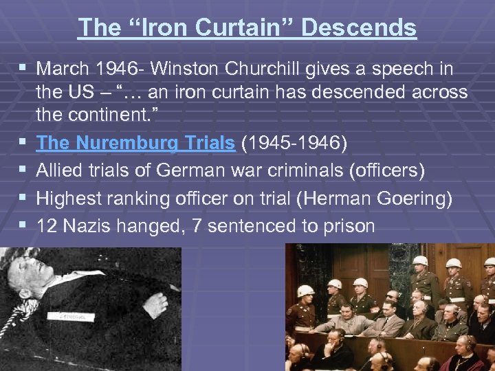 The “Iron Curtain” Descends § March 1946 - Winston Churchill gives a speech in § § the US – “… an iron curtain has descended across the continent. ” The Nuremburg Trials (1945 -1946) Allied trials of German war criminals (officers) Highest ranking officer on trial (Herman Goering) 12 Nazis hanged, 7 sentenced to prison