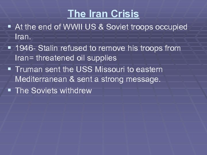 The Iran Crisis § At the end of WWII US & Soviet troops occupied § § § Iran. 1946 - Stalin refused to remove his troops from Iran= threatened oil supplies Truman sent the USS Missouri to eastern Mediterranean & sent a strong message. The Soviets withdrew