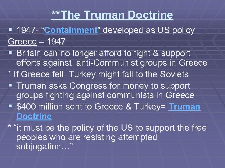 **The Truman Doctrine § 1947 - “Containment” developed as US policy Greece – 1947 § Britain can no longer afford to fight & support efforts against anti-Communist groups in Greece * If Greece fell- Turkey might fall to the Soviets § Truman asks Congress for money to support groups fighting against communists in Greece § $400 million sent to Greece & Turkey= Truman Doctrine * “it must be the policy of the US to support the free peoples who are resisting attempted subjugation…”