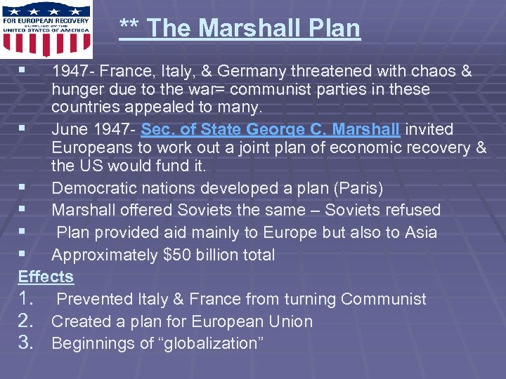 ** The Marshall Plan § 1947 - France, Italy, & Germany threatened with chaos & hunger due to the war= communist parties in these countries appealed to many. § June 1947 - Sec. of State George C. Marshall invited Europeans to work out a joint plan of economic recovery & the US would fund it. § Democratic nations developed a plan (Paris) § Marshall offered Soviets the same – Soviets refused § Plan provided aid mainly to Europe but also to Asia § Approximately $50 billion total Effects 1. Prevented Italy & France from turning Communist 2. Created a plan for European Union 3. Beginnings of “globalization”